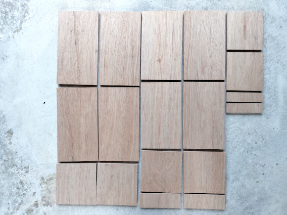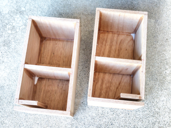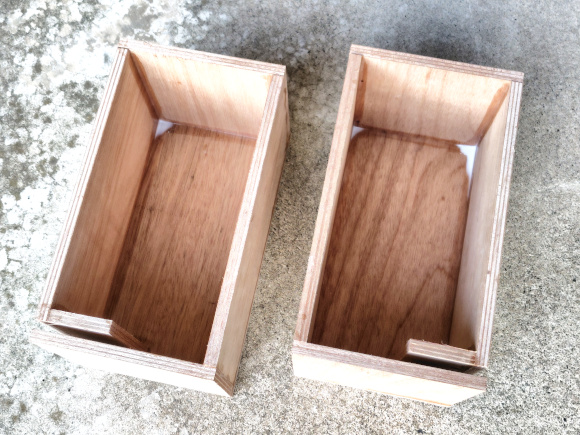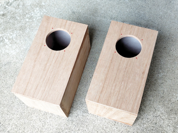 | 基本、過去に3度作ったディスクトップ型のダブルバスレフと同じ設計とします。早速12mm厚の合板をホームセンターで加工してもらいました。何回も作っているのでこのあたりは簡単です。 | |