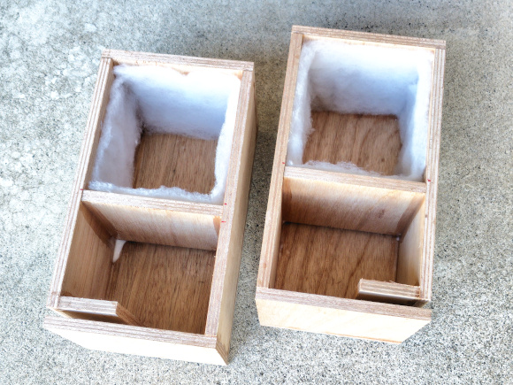 | 今回は第一空気室と第二空気室を分ける合板の位置を調整しています。今までよりスピーカーの口径が大きいので第一空気室を大きくしました。外形が従来と同じなので、当然第二空気室が小さくなるのですが、これが周波数特性にどう影響するか楽しみですね。 | |