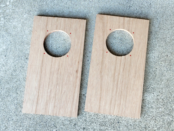 | 穴あけはとても簡単ですね。ここで一旦スピーカーをはめてみて、取り付け穴位置をきちんとマーキングしておくと良いと思います。マーキングは後工程の塗装で見えにくくなるので、キリなどでポンチしておきましょう。 | |