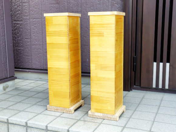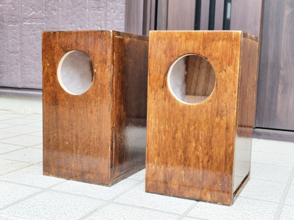 | ディスクトップ型ですが、フロアに置くことも考えてユニットを取り出した前のエンクロージャーは改造してスピーカー台として生まれ変わりました。 | |