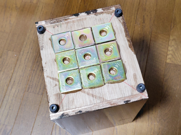 | 底面に重りを万能ボンドで貼り付けます。ゴム足は重りの厚みをカバー出来る寸法の物を木ネジで取り付けます。 | |